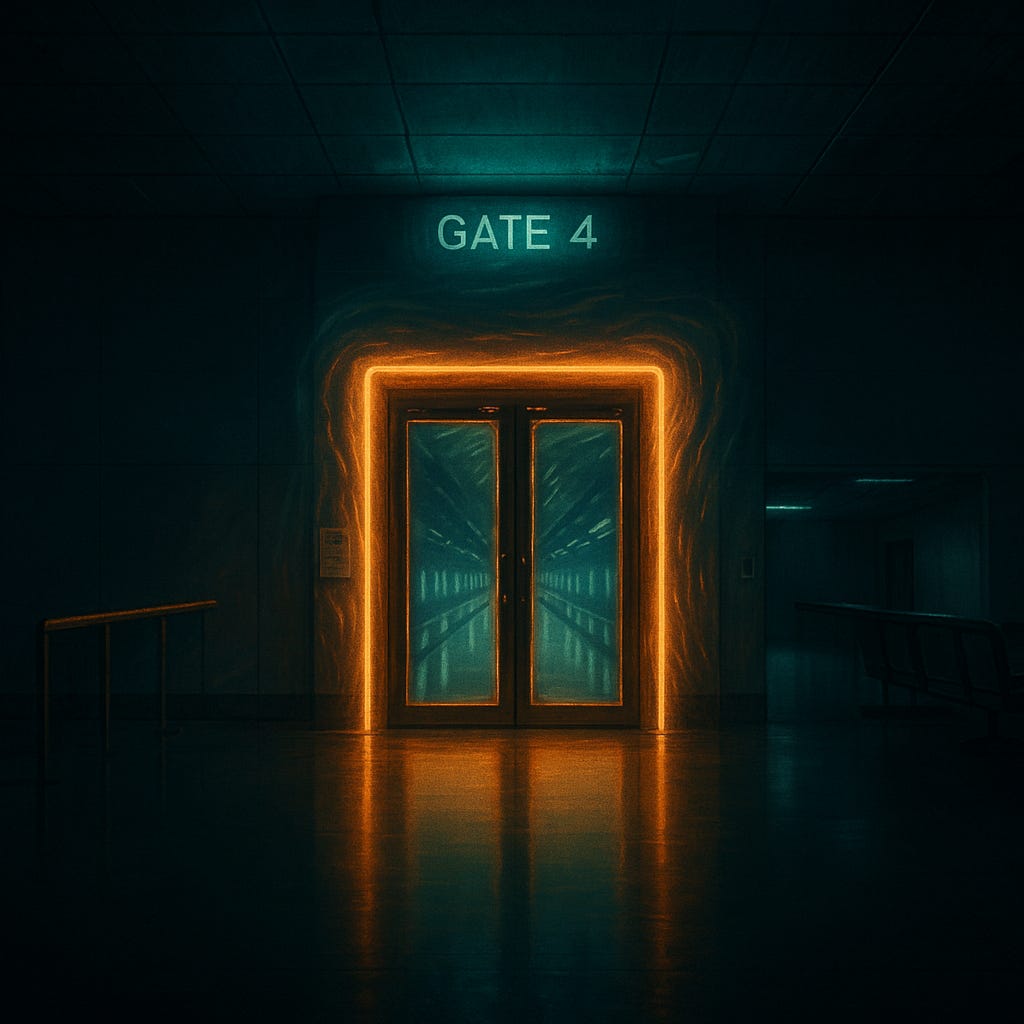 Travelers froze mid-step, then continued as if nothing had happened. The air itself rippled, bending the edges of the hall. Gate Four shimmered ahead like a door that shouldn’t exist.