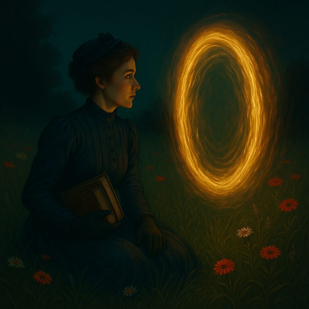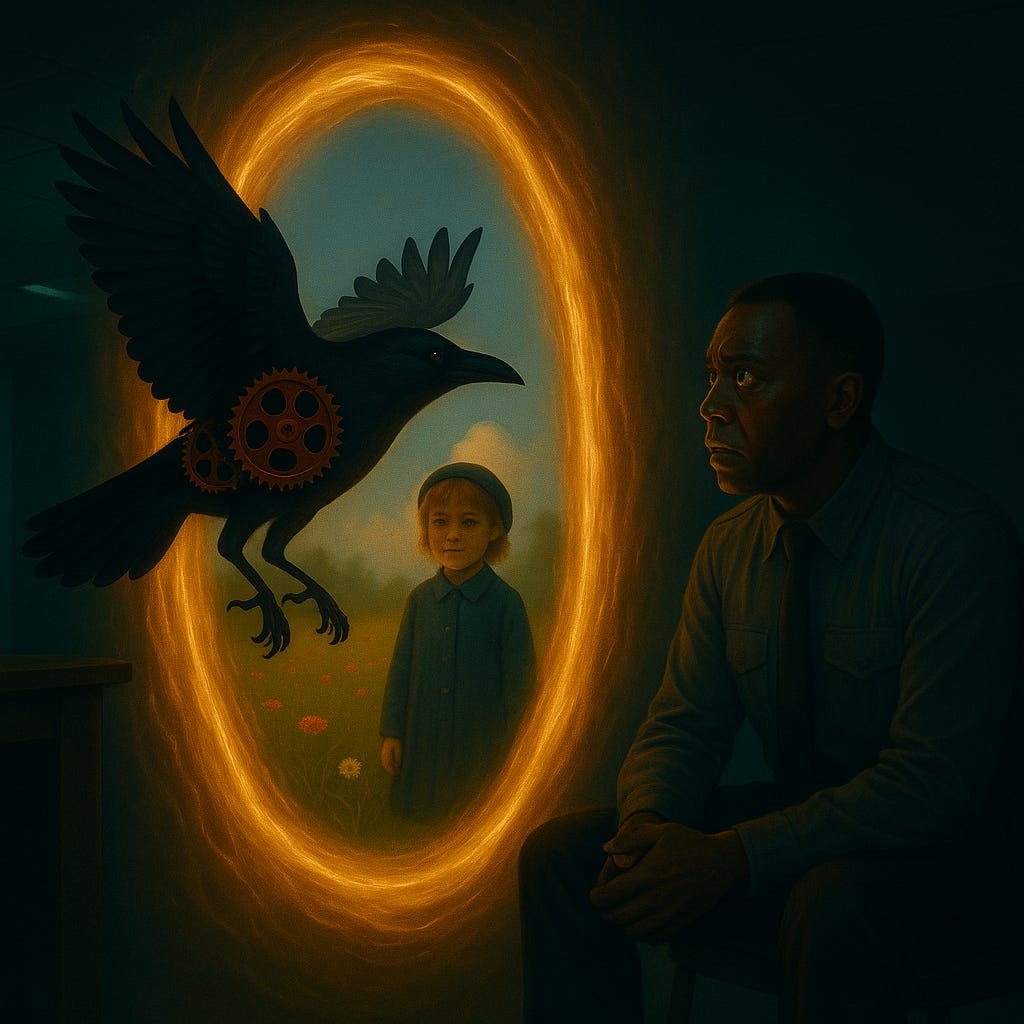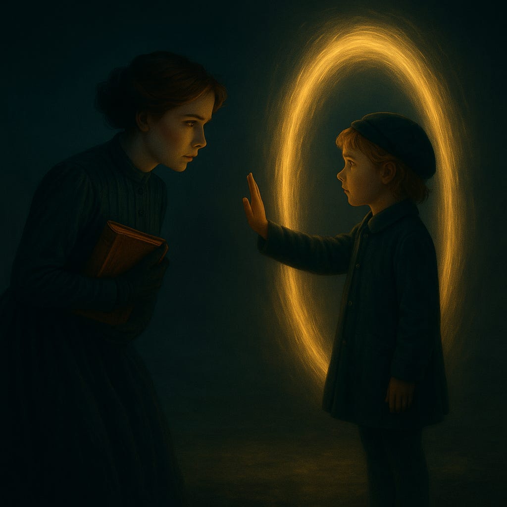 The girl tilted her head, curls bouncing. “Not who. When. I am the hinge.” Her voice carried both the high pitch of youth and the steady cadence of someone far older. She pointed toward the breathing oval. “One of you must walk through. Only one. The other will unravel.”