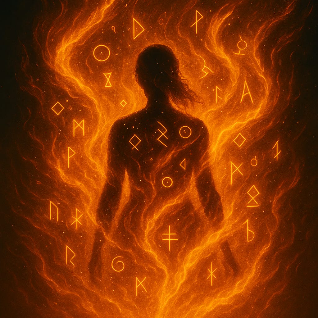 The woman felt the echo of that gesture. Her own hands, still aflame, cooled to gold. The symbols that had once written themselves across her skin now arranged into a single phrase, one she somehow understood without reading: You are not returning—you are becoming.