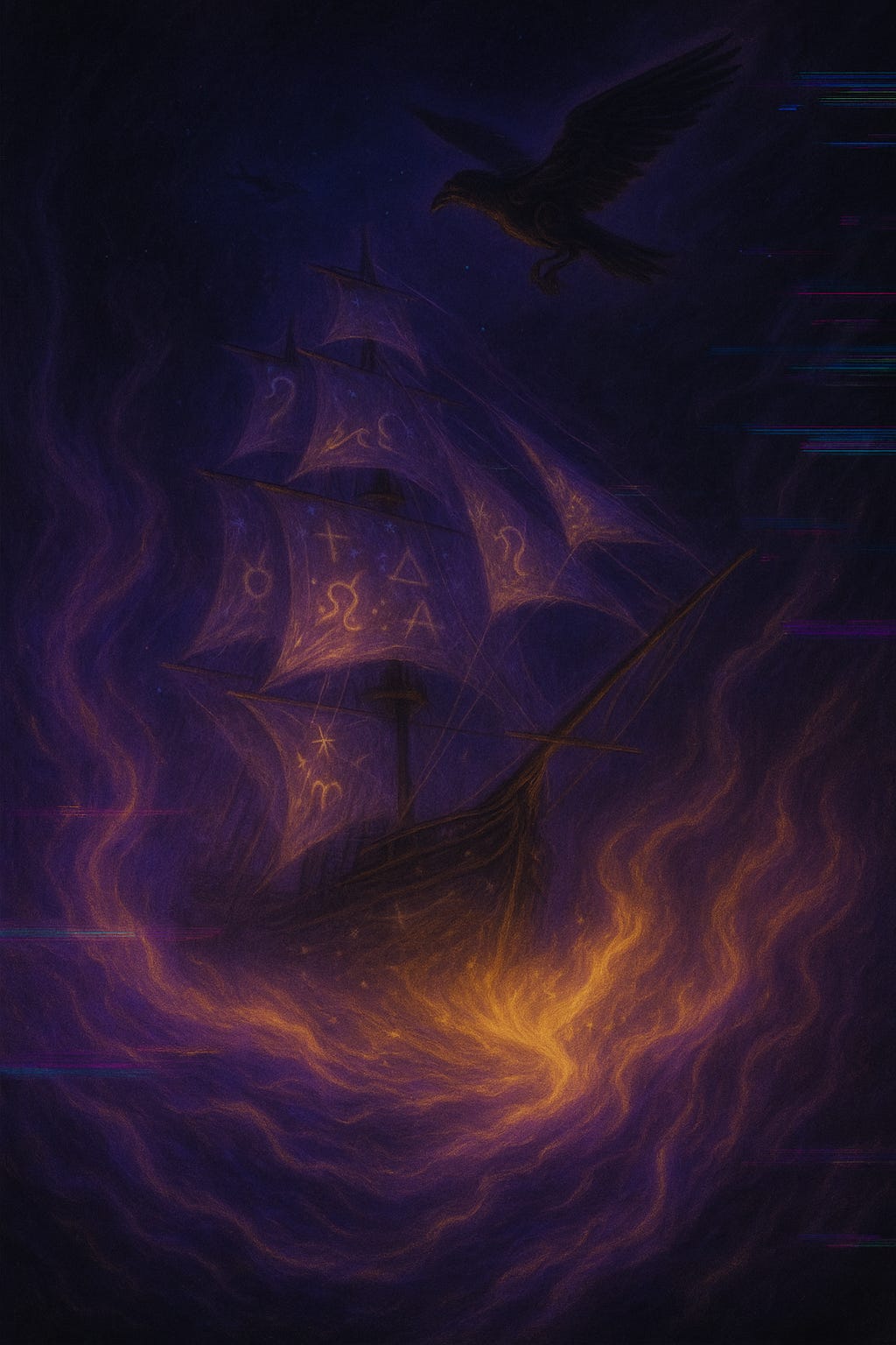 The Gate wavered. For a moment, its light lost discipline—spilling sideways through timelines it was never meant to touch. The fire translated itself into salt air, wood, rope, and distant bells. Stark blinked, disoriented, her wings cutting through smoke that smelled of the sea. A ship loomed from the shimmer, its sails stitched with constellations—degrees, signs, a zodiac written in flame. Voices rode the wind, half-laughter, half-lament. Memories not her own. And then, as suddenly as it came, the vision folded back into violet. The Gate was learning to read itself.