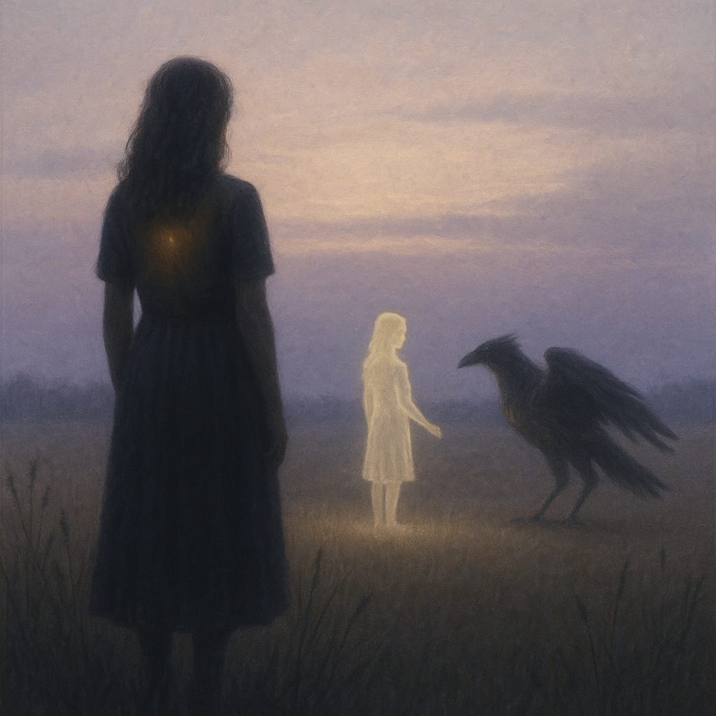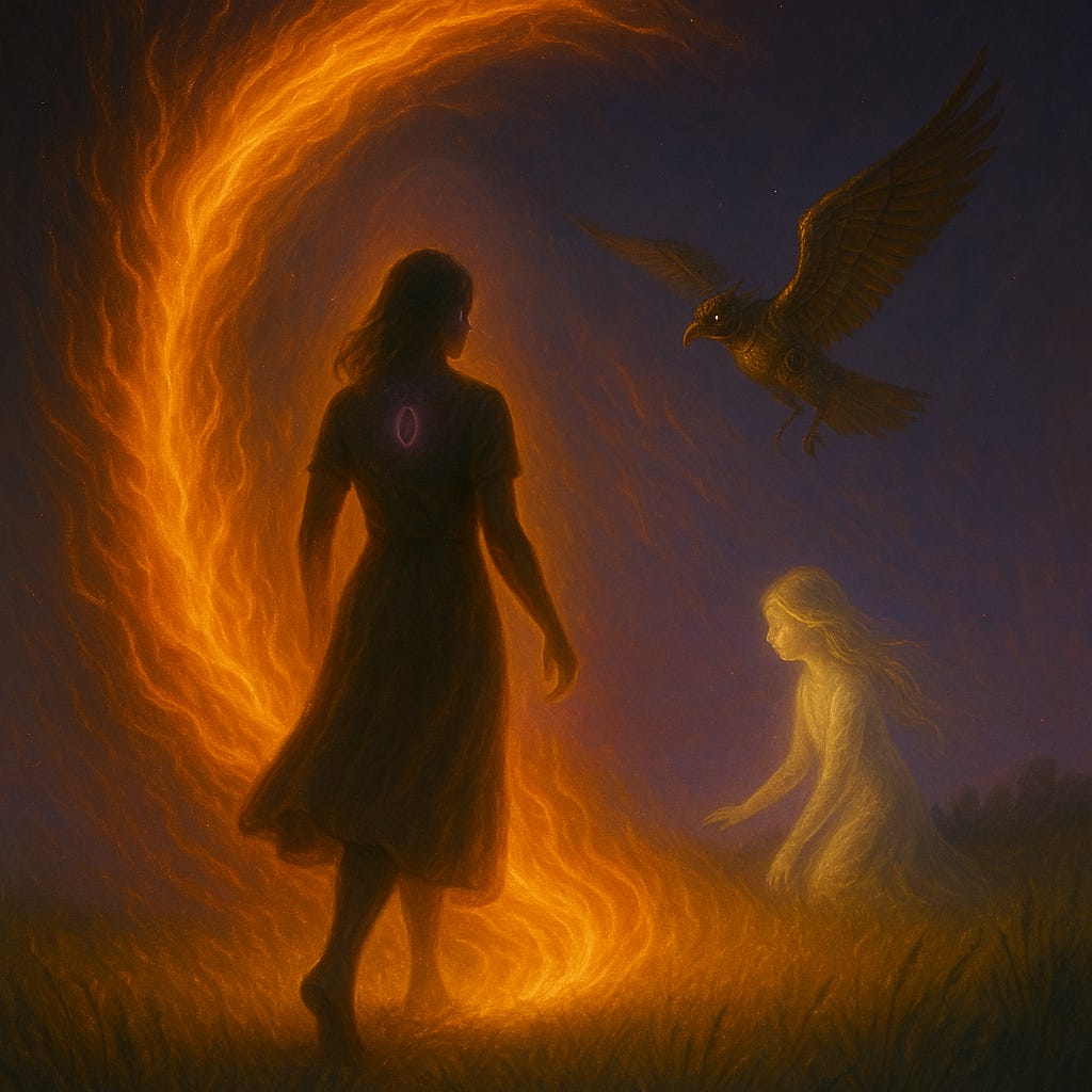 Behind the veil of flame, the meadow reappeared—distorted, refracted through the blaze. Stark hovered at its edge, her brass wings trembling under a weight unseen. The girl of silver light knelt among the grass, one hand pressed to the earth as if listening to its pulse. And the boy stood motionless, his shadow gone. He watched the fire like a mirror he’d lost his reflection in.