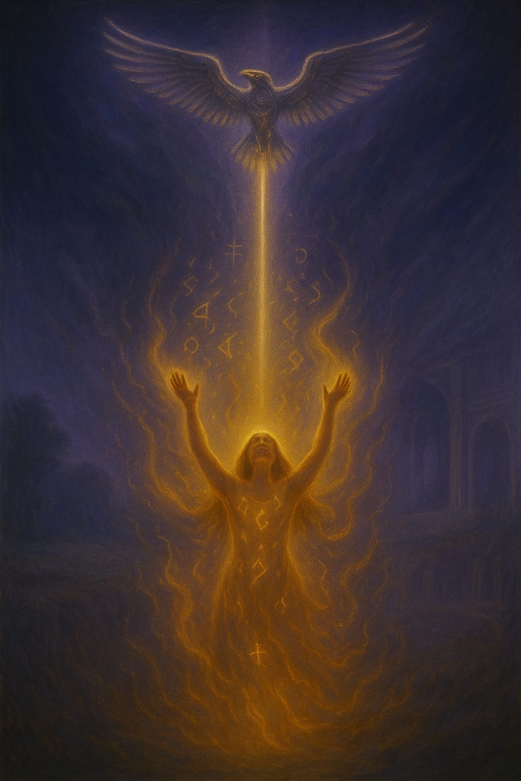 The Gate’s voice was not sound but pressure, a hum against her bones. Symbols swam through her skin, rewriting marrow into message. Every nerve became a wire, every thought a corridor the light could walk through. She tried to breathe, but even that was a dialogue now—inhale, interpretation; exhale, response. The fire was speaking in her, not to her.