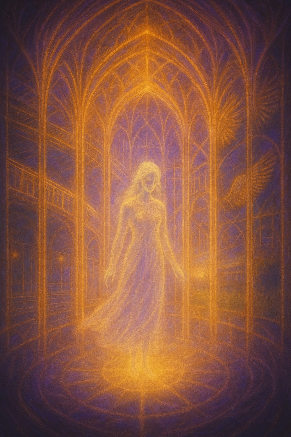 The Gate pulsed once, almost in apology, and the fire reassembled itself into shape and structure—a cathedral of light folding inward on itself. The woman stood within its heart, half-formed, half-remembered. Every surface around her was a reflection of something she had lost: a station platform, a field of grass, a brass wing unfolding in slow motion. Each image flared, then fell away, as though the Gate were testing which version of her was real.