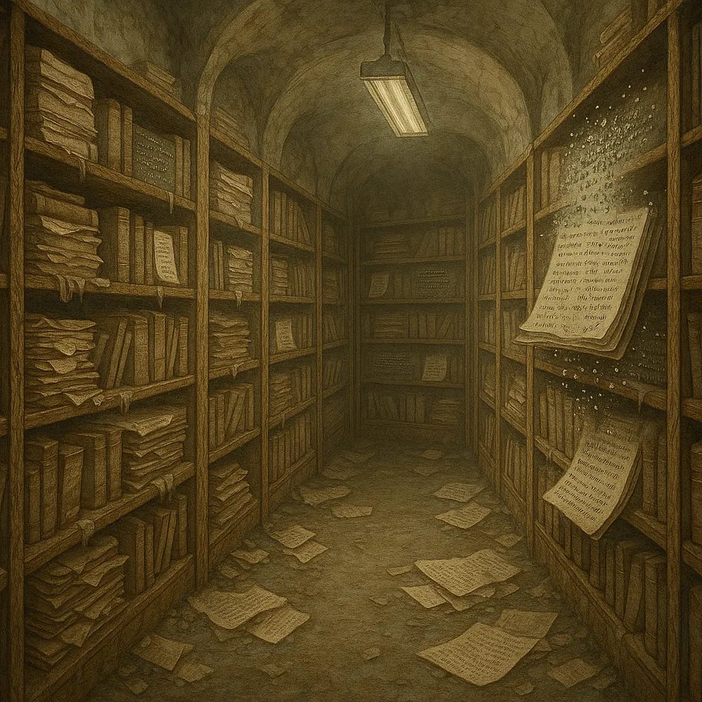 On my first day, the Arkive greets me with the stink of damp concrete and paper that’s been sweating in the dark too long. The air is so thick I taste rust on the back of my tongue. The overhead lights flicker like they’re deciding whether to stay alive, and for a moment I wonder if this is all a test—if someone is watching how long I’ll stand here before turning back.
